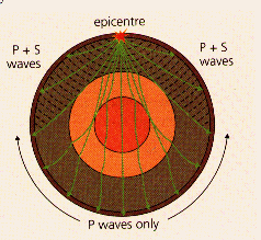 P Waves (primary waves) are Longitudinal waves and fast moving they can travel through Liquid AND Solid so CAN travel through outer core